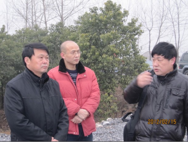荊門市供水總公司總經理陳衛(wèi)國(左一)、黨委書記陳永根(左二)到華能荊門熱電聯產工程工地,聽取該項目負責人介紹工程建設前期用水需求。