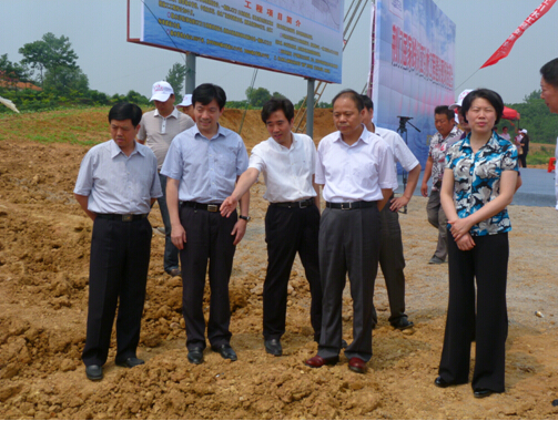 ![]() 市委書記萬(wàn)勇(右二)、市長(zhǎng)肖菊華(右一)、副市長(zhǎng)鄭中華(左一)等領(lǐng)導(dǎo)觀摩施工現(xiàn)場(chǎng)