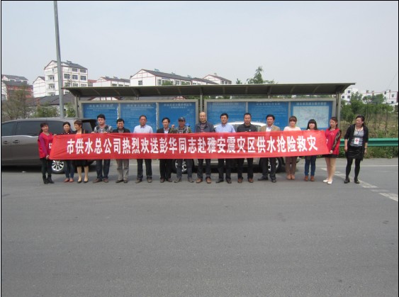 4月25日,荊門(mén)市供水總公司黨委書(shū)記陳永根,副總經(jīng)理王宜龍等一行到荊門(mén)南高速路口歡送加壓站職工彭華隨湖北紅十字會(huì)12人供水救援隊(duì)赴雅安震災(zāi)區(qū)搶險(xiǎn)救災(zāi)。出發(fā)前,該司領(lǐng)導(dǎo)囑咐彭華在災(zāi)區(qū)注意自身安全;全力以赴的撲入到搶險(xiǎn)救災(zāi)工作中去;把全體供水職工“心系雅安,你我同在”的愛(ài)心帶去。彭華表示不辜負(fù)全體員工的囑托,把愛(ài)心帶到災(zāi)區(qū),并保證圓滿(mǎn)完成搶險(xiǎn)救災(zāi)任務(wù)。
