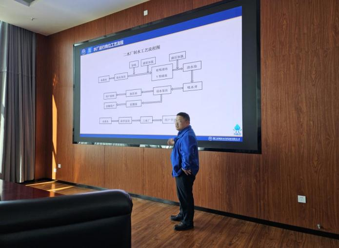 圖為二水廠副廠長劉福成講解制水工藝流程