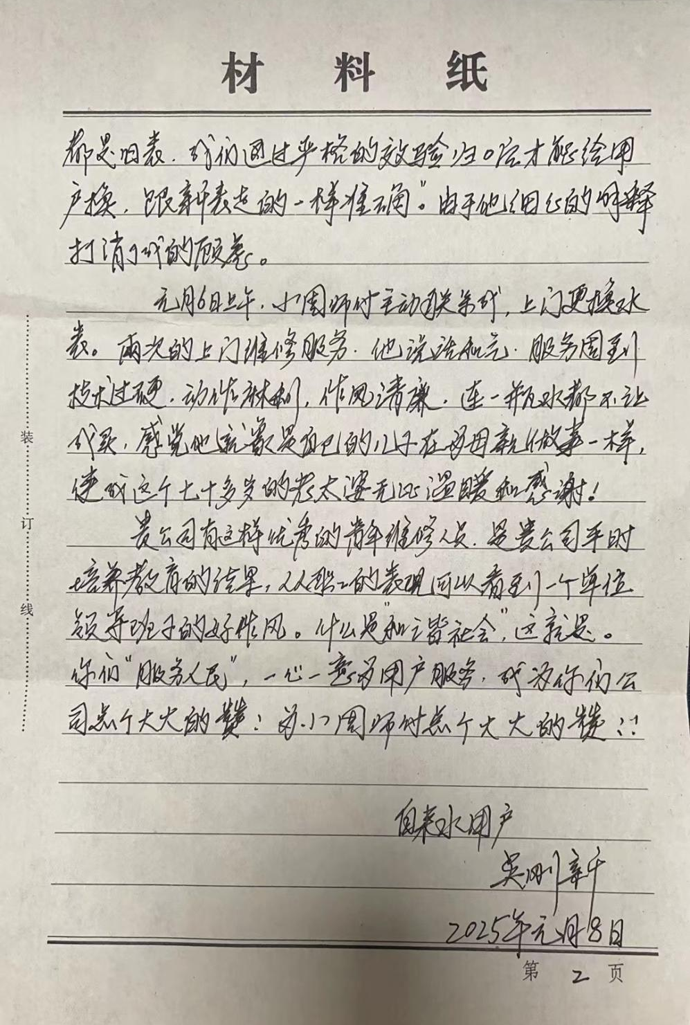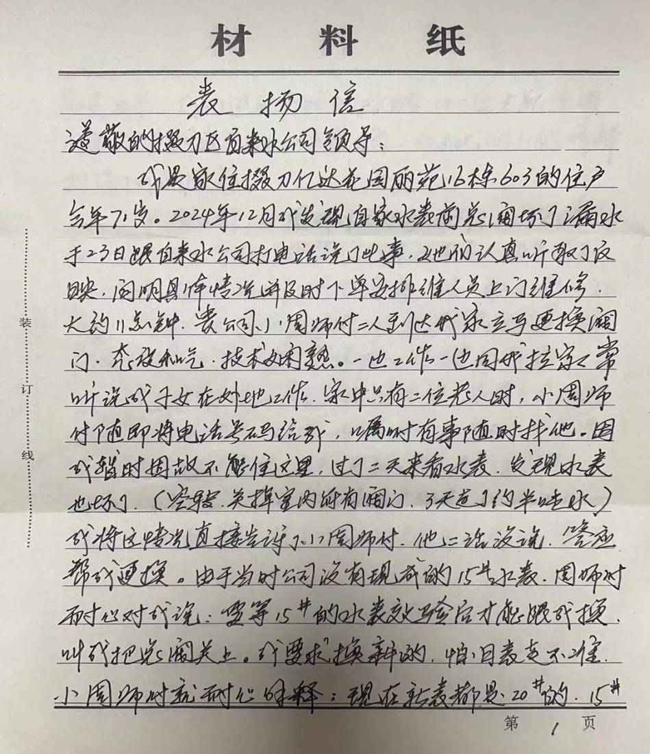 在表揚信中,老人深情表達:“家中只有我們兩位老人,水務(wù)集團的維修人員就像我們的兒子一樣,他說話和氣,服務(wù)周到,技術(shù)過硬,動作麻利,作風(fēng)清廉,讓我們感到無比溫暖。”