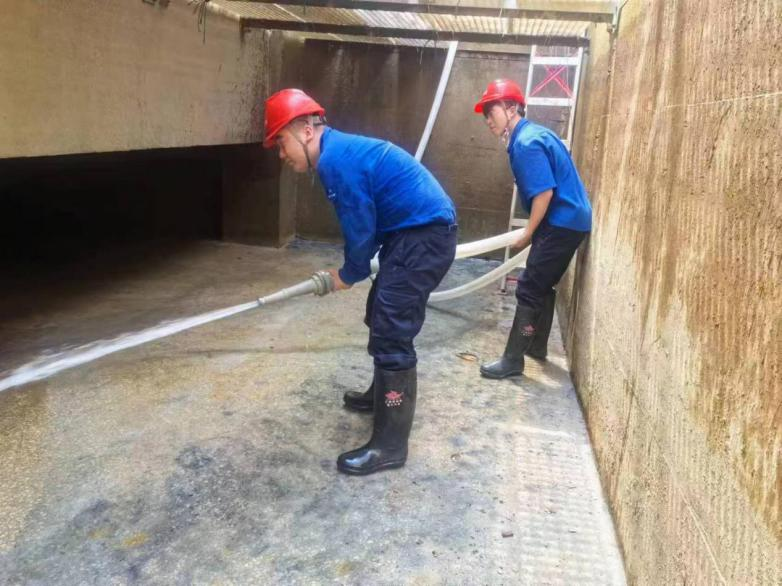 上圖為水廠(chǎng)維修人員正在清洗絮凝沉淀池