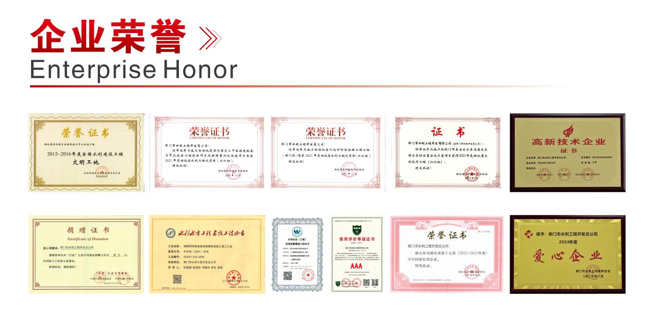 連續(xù)十五年獲評(píng)省市級(jí)“守合同 重信用”單位的榮譽(yù)稱號(hào),連續(xù)十三年榮獲ISO三體系認(rèn)證證書,連續(xù)五年榮獲水利部頒發(fā)的全國水利建設(shè)市場(chǎng)主體信用等級(jí)AAA級(jí)證書。先后被國家、省、市主管部門授予全國企業(yè)征信系統(tǒng)立信單位、省市水利系統(tǒng)先進(jìn)施工企業(yè)、先進(jìn)基層黨組織、安全生產(chǎn)先進(jìn)單位等榮譽(yù)稱號(hào)。