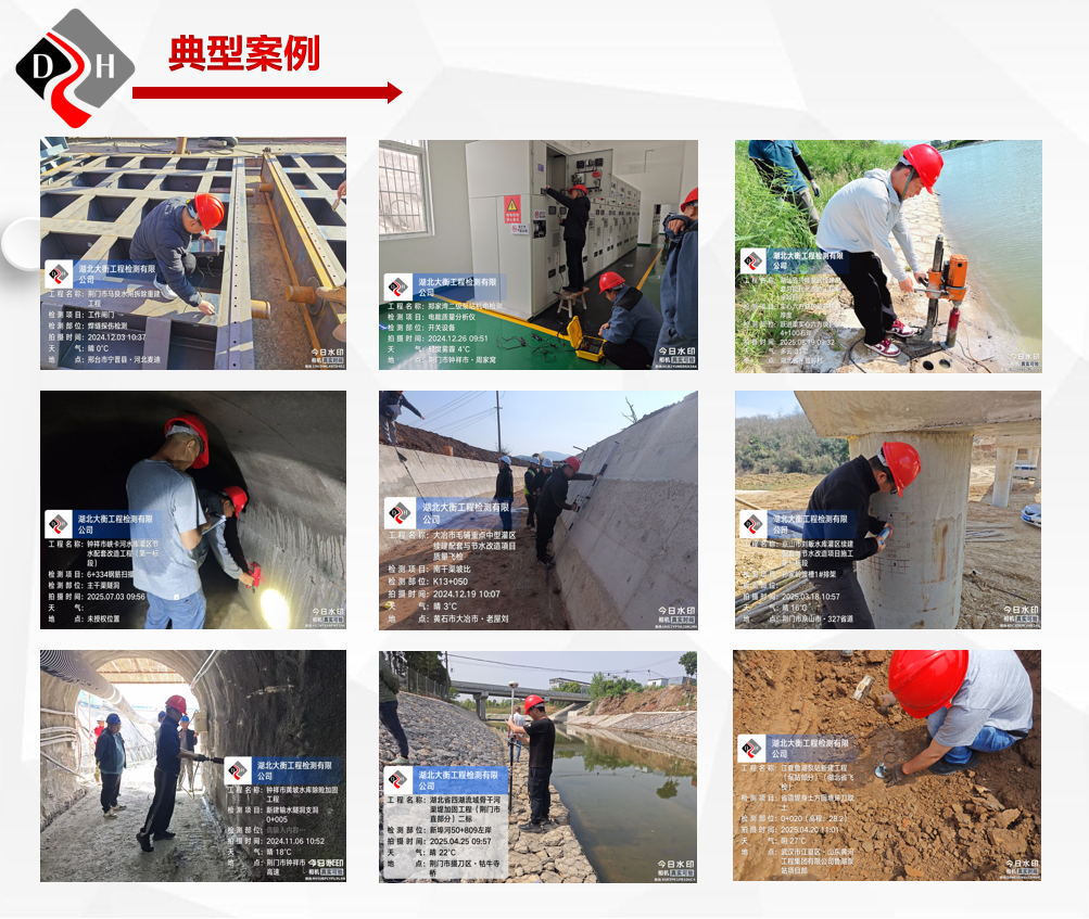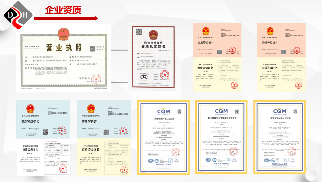 大衡公司持有湖北省市場監(jiān)督管理局評審中心頒發(fā)的CMA計量認證證書(共340項參數(shù)),具有水利工程檢測資質(zhì)巖土、混凝土甲級;量測、金屬結構和機械電氣類乙級。業(yè)務范圍涵蓋水庫除險加固、灌區(qū)續(xù)建配套與節(jié)水改造、泵站更新改造、堤防工程、河道治理、農(nóng)村安全飲水、土地復核等多個領域,連續(xù)四年承擔湖北省水利廳水利工程飛檢任務,以誠信經(jīng)營與專業(yè)服務樹立行業(yè)口碑。