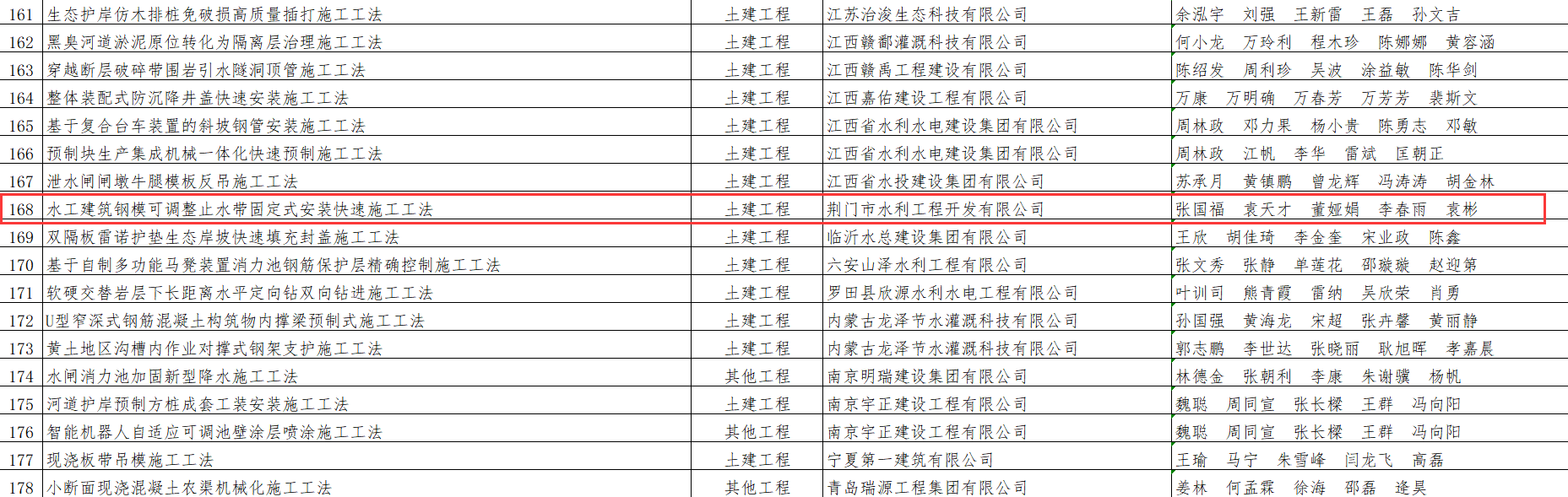 近日,中國水利工程協(xié)會公布了2025年度水利行業(yè)工法名單,荊門市城市水務(wù)集團有限公司下屬單位荊門市水利工程開發(fā)有限公司(以下簡稱“荊門水發(fā)”)申報的“水工建筑鋼模可調(diào)整止水帶固定式安裝快速施工工法”順利通過評審,正式被確認為中國水利行業(yè)工法,為水利工程標(biāo)準(zhǔn)化、高效化建設(shè)提供了有力支撐。