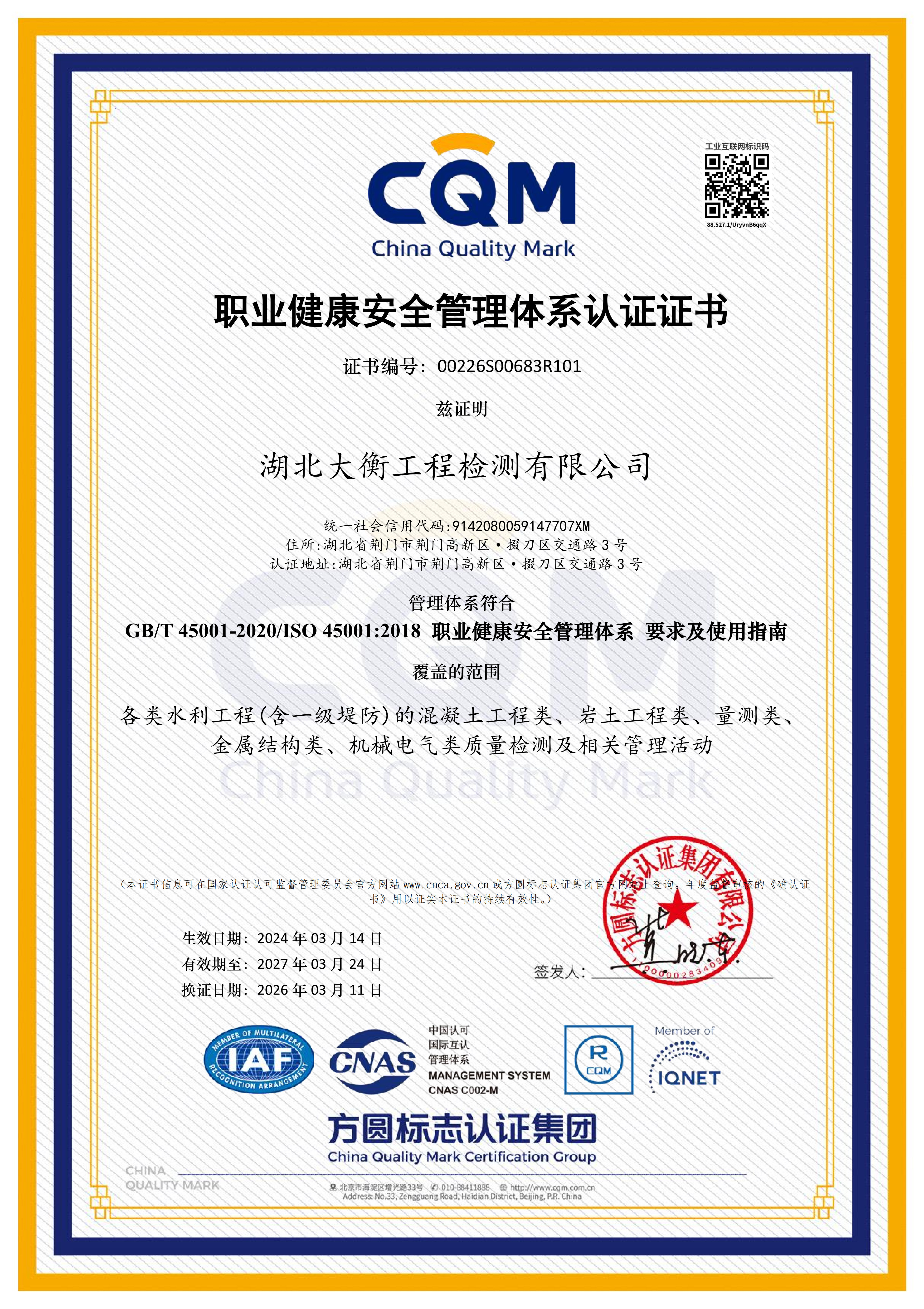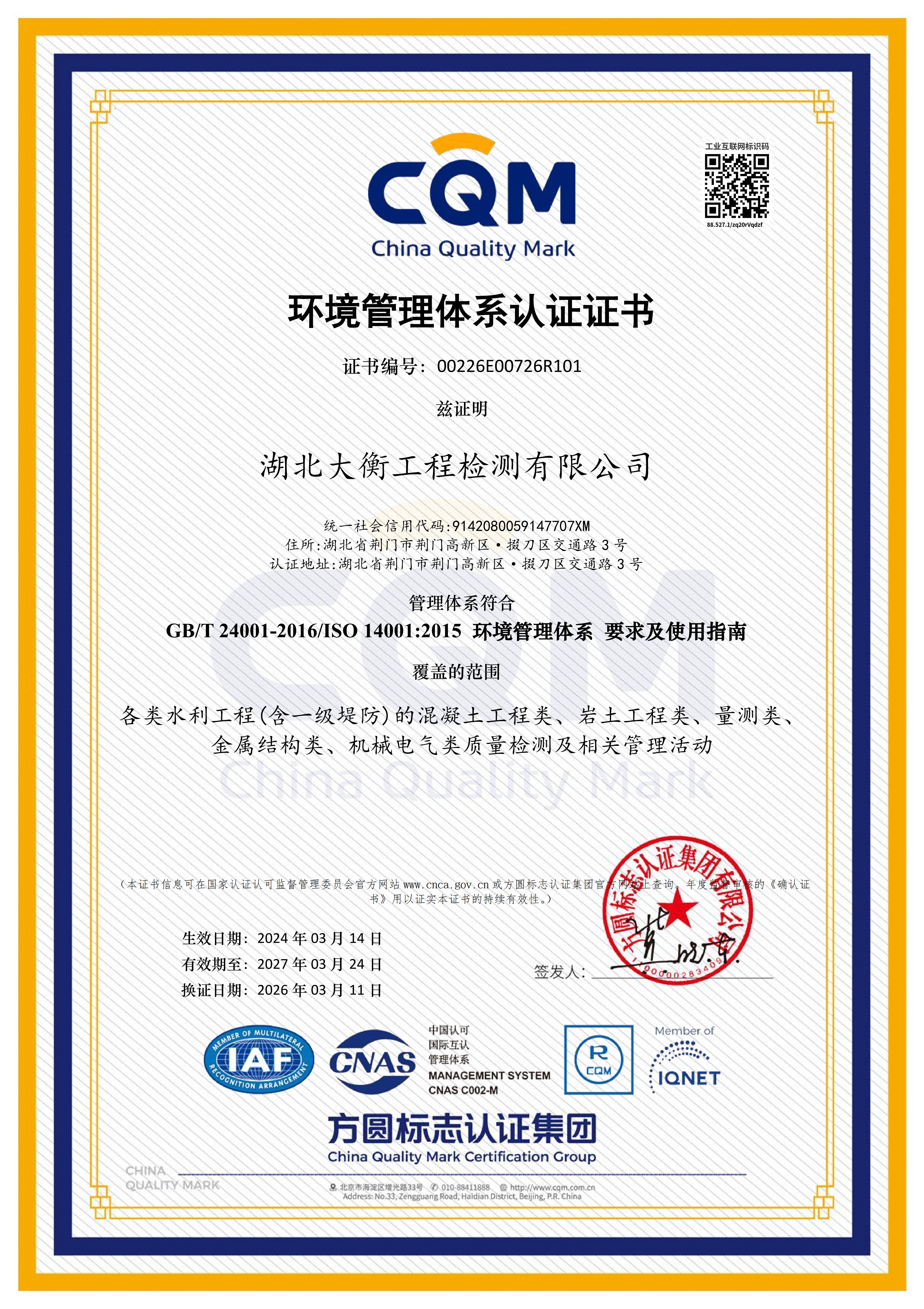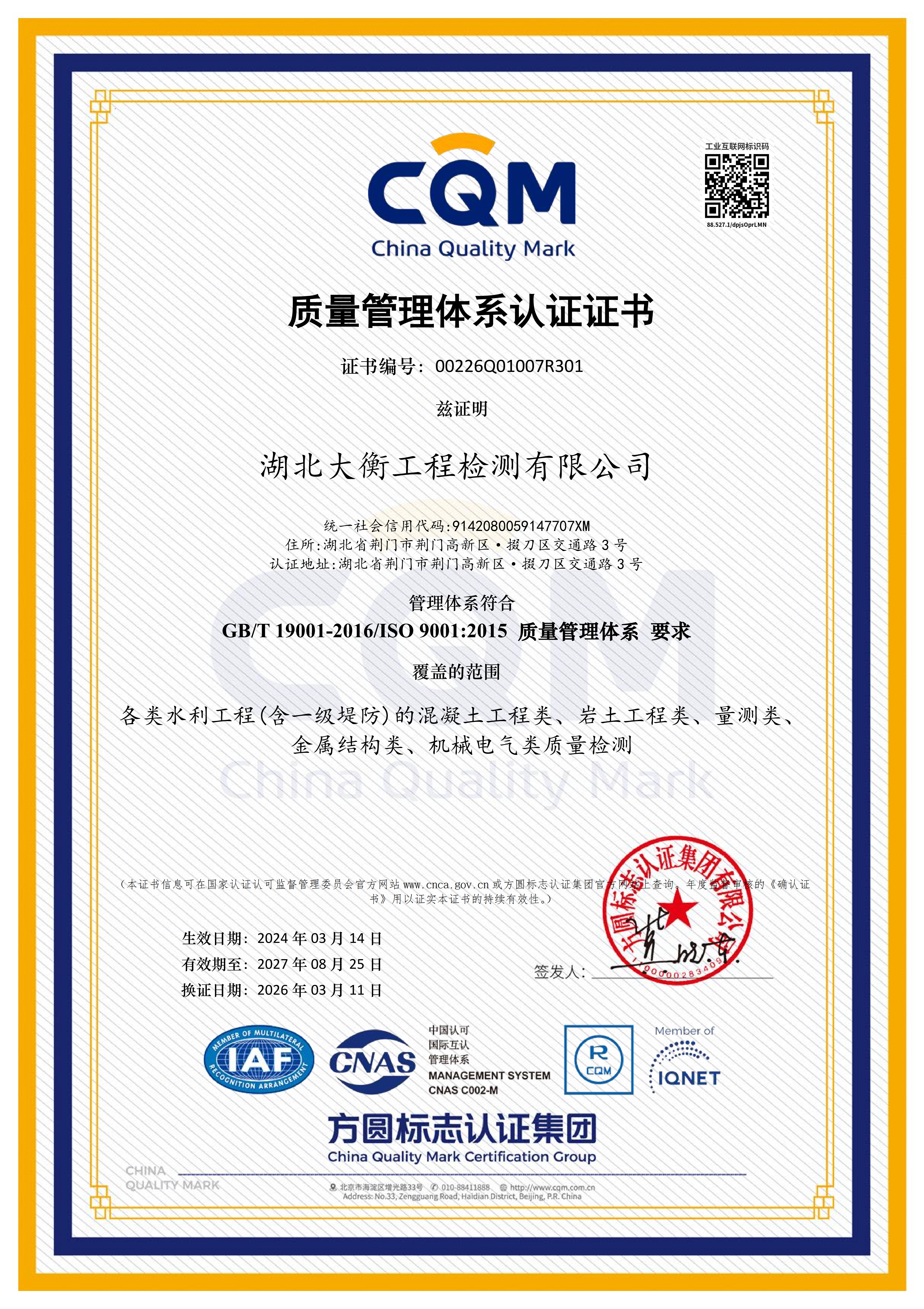 此次“QEO”三體系再認證圓滿通過,是大衡公司持續(xù)深化國企改革、夯實管理基礎(chǔ)、提升核心競爭力的重要體現(xiàn)。下一步,大衡公司將嚴格對標集團“十五五”質(zhì)量發(fā)展專項規(guī)劃部署,健全一體化質(zhì)量管理體系,厚植質(zhì)量文化底蘊,強化水利工程檢測全流程精細化管控,持續(xù)鍛造規(guī)范化、專業(yè)化、可靠化的水利工程檢測服務(wù)品牌,為集團高質(zhì)量發(fā)展提供堅實技術(shù)支撐與質(zhì)量保障。