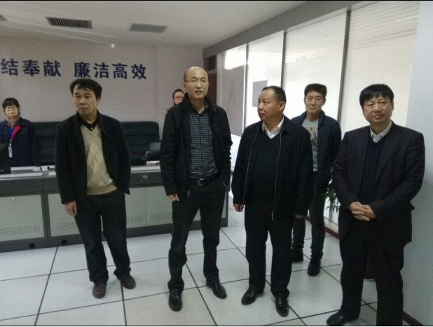 4月14日,省文明辦主任胡和平(前排右二)在市委常委、市委秘書長周友坤(右一)、市委宣傳部副部長、文明辦主任樊雁陪同下到公司指導創(chuàng)建全國文明單位工作,市供水總公司黨委書記、總經(jīng)理陳永根介紹相關(guān)情況。圖為在調(diào)度監(jiān)控中心視察時的情景。