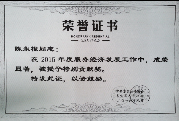 近日,公司因服務(wù)“四區(qū)兩園”成績突出,黨委書記、總經(jīng)理陳永根被東寶區(qū)委、區(qū)政府授予“服務(wù)經(jīng)濟(jì)發(fā)展工作特別貢獻(xiàn)獎(jiǎng)”。