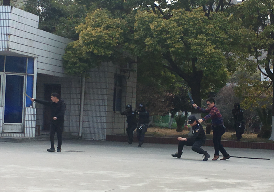 本次演練以在全國“兩會”召開前夕,2名暴恐份子密謀在市供水總公司三水廠采取投毒方式實施暴恐襲擊為背景展開。市公安局指揮中心接到水廠員工報案,2名暴恐份子駕車攜帶劇毒氰化物和匕首來到三水廠,密謀投毒、傷人。市公安局指揮中心立即派轄區(qū)派出所和巡邏組前往處置。在投毒失敗后,嫌疑人刺傷安保人員并挾持人質(zhì),與民警對峙。隨后,市公安局迅速啟動反恐防范一級響應,調(diào)派轄區(qū)分局、巡特警、刑偵、交警等部門趕赴現(xiàn)場開展工作。短短3分鐘,暴徒迅速被控制,其中有一名暴徒被當場擊斃,人質(zhì)被成功解救。之后,120急救中心趕往現(xiàn)場救治,同時環(huán)境監(jiān)測部門迅速開展水質(zhì)檢測評估,確保水廠供水安全。至此,反恐防暴演練活動順利結(jié)束。