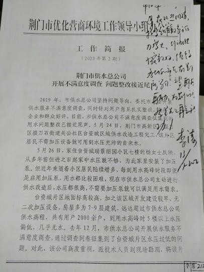 713日,市委副書記、市委政法委書記李濤在市優(yōu)化辦第2期工作簡報(bào)專文《荊門市供水總公司開展不滿意度調(diào)查 問題整改接近尾聲》上作出批示,指出“市供水總公司在改進(jìn)服務(wù)、提高工作效率方面力度大、行動(dòng)快、成效好,值得各地和市直有關(guān)部門學(xué)習(xí),望再接再厲,為荊門高質(zhì)量發(fā)展再立新功”,對(duì)公司優(yōu)化供水服務(wù)工作給予高度評(píng)價(jià)和充分肯定。