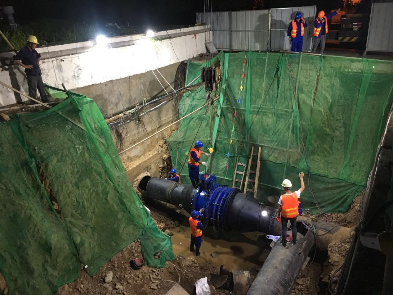 20日晚10時(shí),項(xiàng)目現(xiàn)場管理人員強(qiáng)化工序銜接,緊盯現(xiàn)場監(jiān)督,施工作業(yè)人員挑燈夜戰(zhàn),施工隊(duì)伍兵分三路,密切協(xié)調(diào)配合,分別對(duì)DN1200、DN1000鋼管共5處碰頭點(diǎn)進(jìn)行施工,管道切割、排水、吊裝、安裝閥門、焊接……施工現(xiàn)場井然有序,一道道工序推進(jìn)有條不紊,不一會(huì)兒工人們的汗水都濕透了全身。21日凌晨2:00突降暴雨,施工人員“硬核”表現(xiàn),克服惡劣天氣的影響,在水中連續(xù)辛勤作業(yè)近10個(gè)小時(shí),碰頭任務(wù)于21日8時(shí)順利完工。