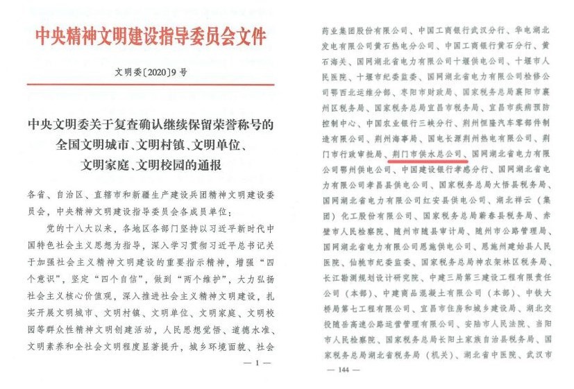 據(jù)悉,“全國文明單位”稱號是中央文明委授予創(chuàng)建單位的最高榮譽。市供水總公司繼續(xù)保留榮譽稱號,是企業(yè)文明單位創(chuàng)建活動扎實推進(jìn)、創(chuàng)新發(fā)展的一大豐碩成果。公司連續(xù)十一屆被省委、省政府授予省級文明單位,連續(xù)十二屆被市委、市政府授予市最佳文明單位,2017年被中央文明辦授予“全國文明單位”。2018年,在市消費者委員會發(fā)起的公服企業(yè)滿意度調(diào)查中,公司總成績排名第一,被授予“消費者滿意單位”和“消費者滿意品牌”。2019年,由于成功推行卓越績效管理和用戶滿意管理,被市政府評選為第七屆荊門市“市長質(zhì)量獎”獲獎企業(yè);因全面推進(jìn)依法治企,被評為湖北省省級“法治建設(shè)示范企業(yè)”;被荊楚網(wǎng)表彰為“全省優(yōu)秀政務(wù)微信公眾號”;作為全國唯一一家供水企業(yè),榮獲2019年全國市場質(zhì)量信用AA等級“用戶滿意企業(yè)”稱號。2020年,公司先后被評為荊門市建設(shè)江漢平原振興發(fā)展示范區(qū)先進(jìn)集體,在全市要素保障類滿意度測評中繼續(xù)名列榜首。三水廠團支部被共青團中央表彰為“全國五四紅旗團支部”。詠泉水質(zhì)檢測有限公司曹俊同志榮獲“全市優(yōu)秀共產(chǎn)黨員”和“荊門市抗擊新冠肺炎疫情先進(jìn)個人”榮譽,供水維修班長黃磊獲評“荊門好人·最美逆行者”榮譽稱號,加壓站員工閆寒家庭榮獲2020年“最美家庭”榮譽稱號。